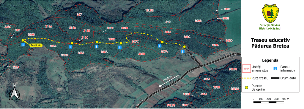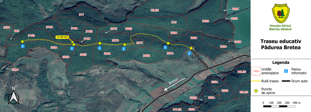 GPS coordinates of the educational route Bretea Forest are 47.135833 / 24.257500 (start route); 47.136944 / 24.229722 (route end).