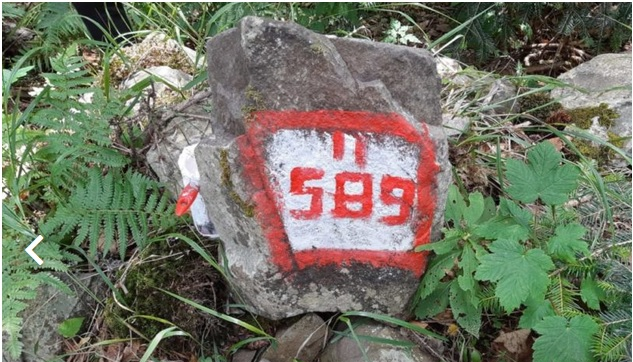 White square with coloured border inside which are two numbers: Roman numerals and Arabic numerals. Landmark to identify the position on the forestry map. This marker is found on the same tree as the marker with two horizontal double bands separated by white tape (compartment boundary intersection). The Roman numeral represents the management unit and the Arabic numeral represents the forest boundary stone number