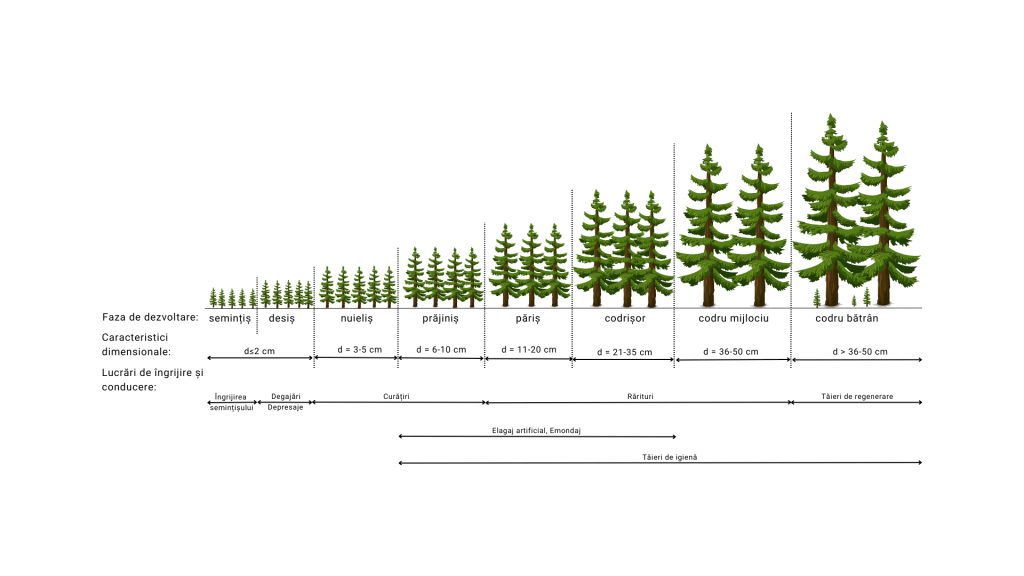 This is a special work aimed at increasing the proportion of knot-free wood suitable for high-quality varieties. It is applied selectively, in stands of superior or at least medium productivity, only on trees of value. The work consists in removing the dry branches from the base of the stems, at a height of 2-3 meters, and during the subsequent returns, it is advanced up to 5-6 meters, respectively up to about 8 meters.
