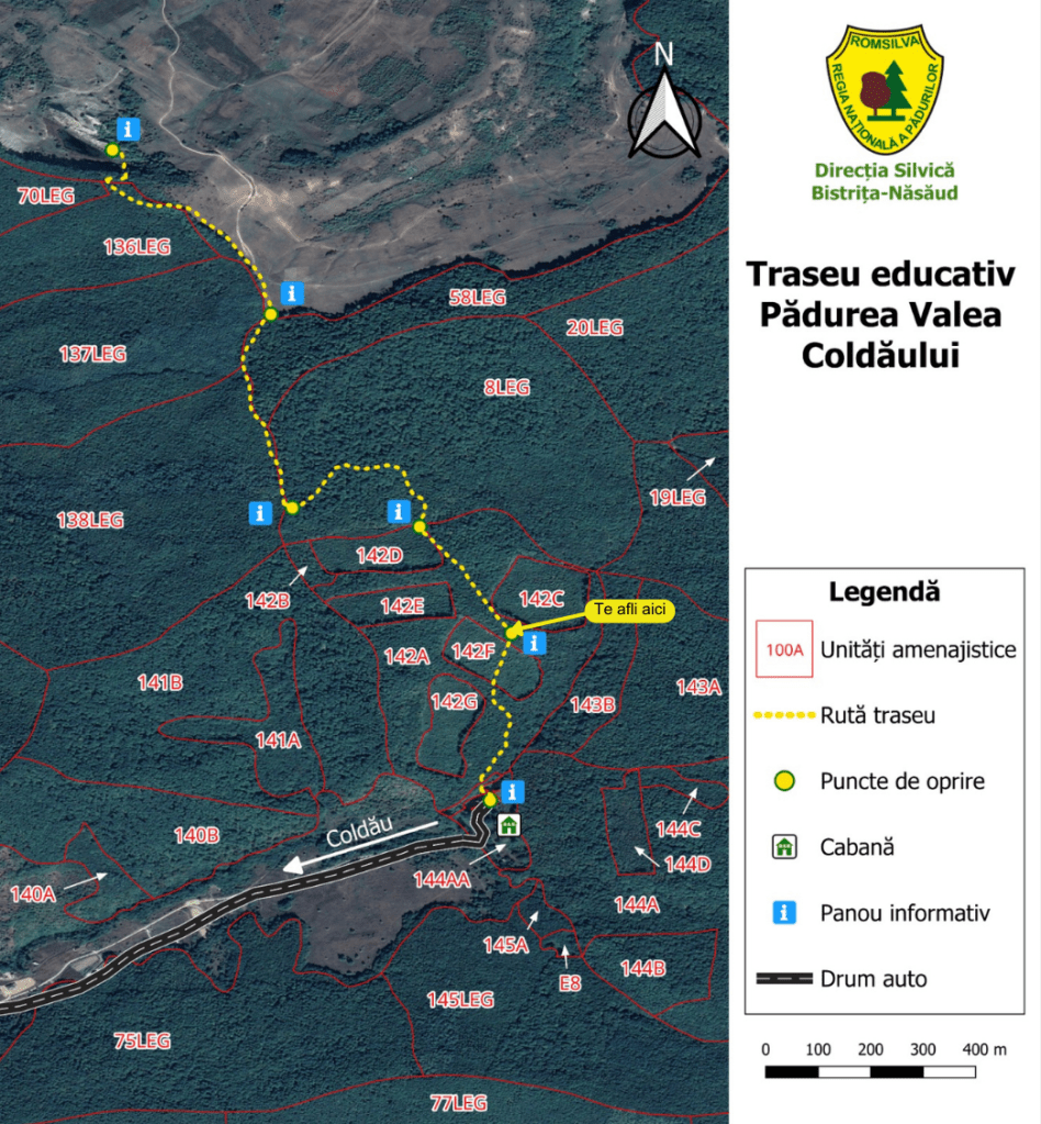 This educational route starts from Coldău Chalet, goes through forest unit 142 from Management Unit IV Chiuza, a state-owned forest managed by Beclean Forestry District, and it continues to forest unit 8, a forest belonging to administrative-territorial unit Căianu-Mic, on existing footpaths and take-out roads, until meeting on the right with forest unit 58 of the same owner, and on the left with forest unit 137, forest belonging to natural persons, continuing to Cetățele Lake.