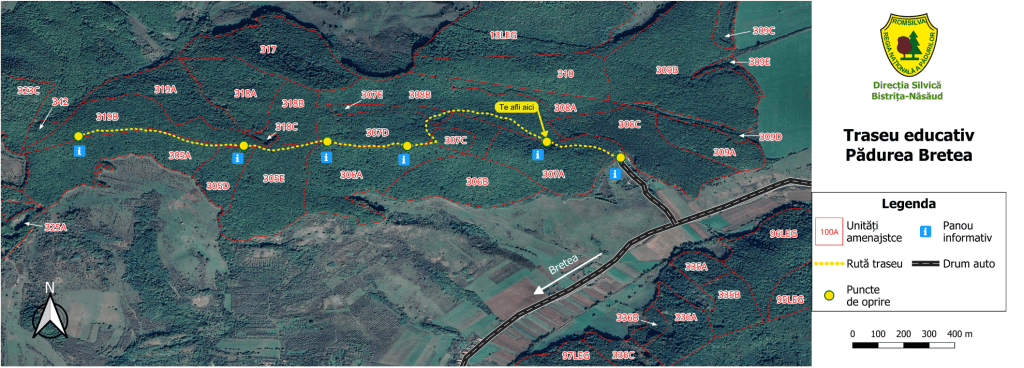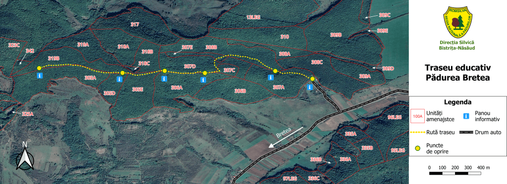 În acest moment ne aflăm în unitatea de producție (U.P.) I Bistrița a Ocolului Silvic Bistrița, din cadrul Direcției Silvice Bistrița-Năsăud. Traseul parcurge unitățile amenajistice (u.a.) 307A, 308B, 307E, 307C, 307D, 305E, 305A, iar la final ajungem în unitatea amenajistică 319B. La întoarcere ne vom deplasa pe același traseu.