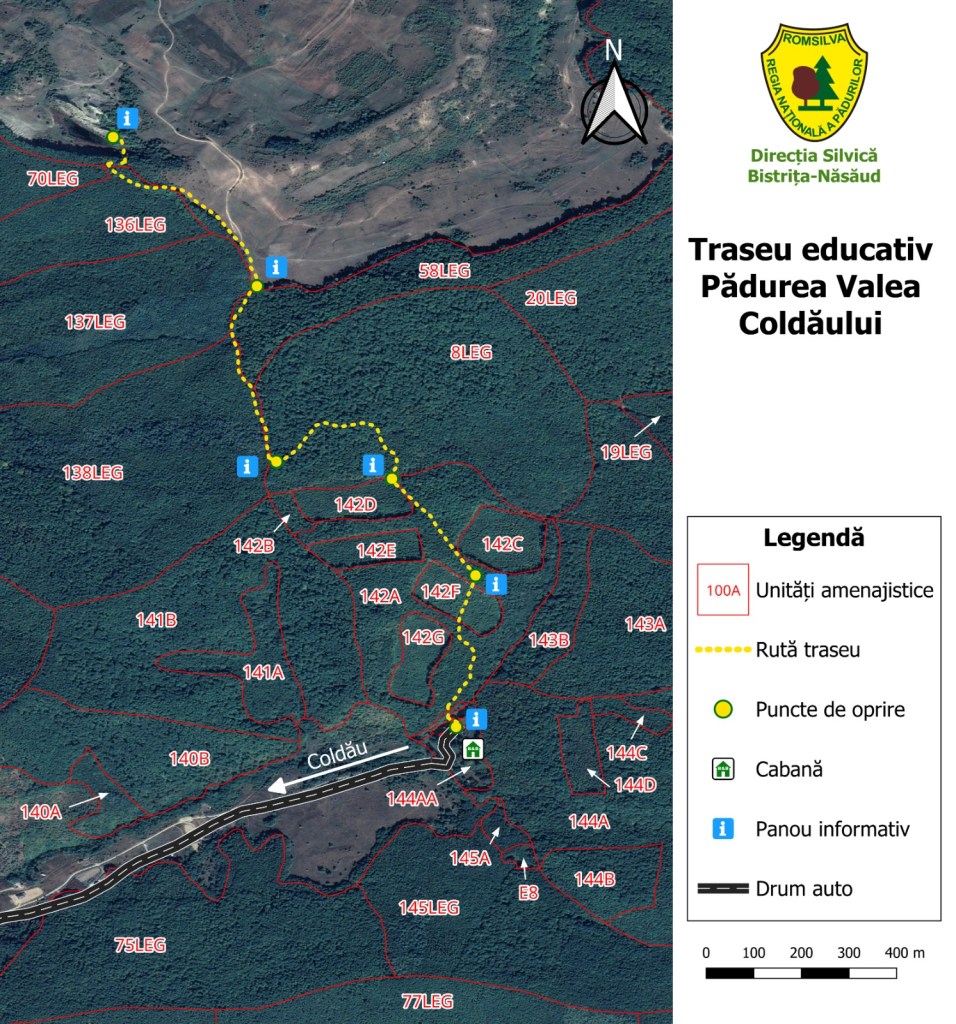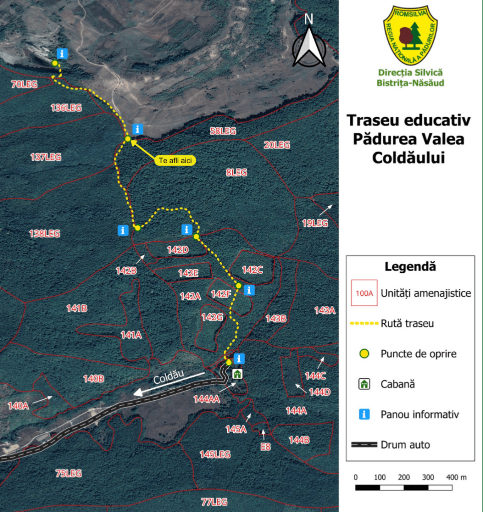 Traseul educativ începe de la Cabana Silvică Coldău, parcurge u.a. 142 din U.P. IV Chiuza, pădure de stat administrată de către O.S. Beclean, iar în continuare parcurge unitatea amenajistică 8, pădure aparținând U.A.T. Căianu-Mic, pe poteci existente și drumuri de scos-apropiat, până la întâlnirea pe dreapta cu u.a. 58 a aceluiași proprietar, iar pe stânga cu u.a. 137, pădure a persoanelor fizice, continuându-se până la Lacul Cetățele.
